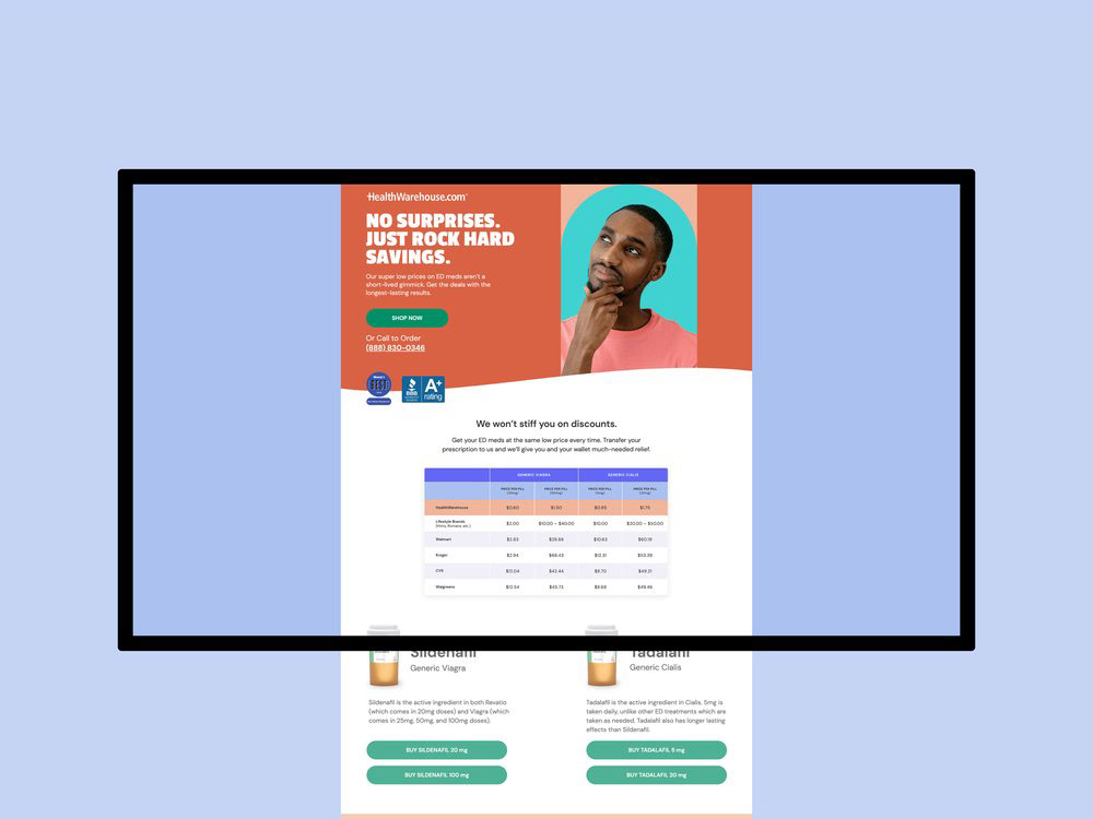 Amid the crowd of competitors – who deliver on flash, but not on price – HealthWarehouse’s goal was to stand out, both in visuals and messaging.